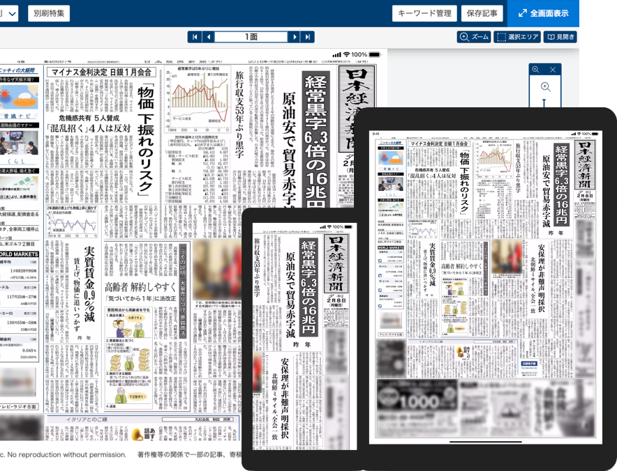 紙面のレイアウトそのままで読めるのが紙面ビューアーです。パソコンでのご利用のほか、タブレット・スマホ向けのアプリではタッチ操作で快適に読むことができます。