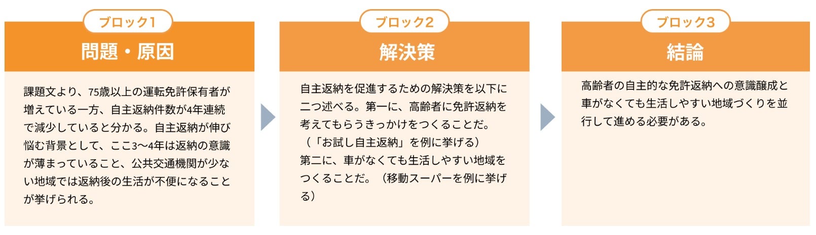 こういった典型的なテーマの場合、解決策として「免許返納するように高齢者に周知徹底する」「呼びかけをする」のようなありきたりな策ではやや物足りない。解答例でも書いたように「(お試し自主返納などを通して)段階的に返納に移行する」など、呼びかけではなかなか変わらない現状に対してどうアプローチするかまで書けると、採点者に「おっ」と思わせるややレベルの高い答案になるでしょう。