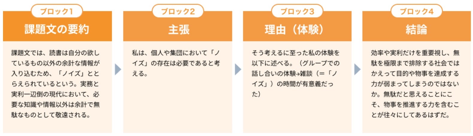 課題文の要約 → 主張 → 理由(体験)→ 結論