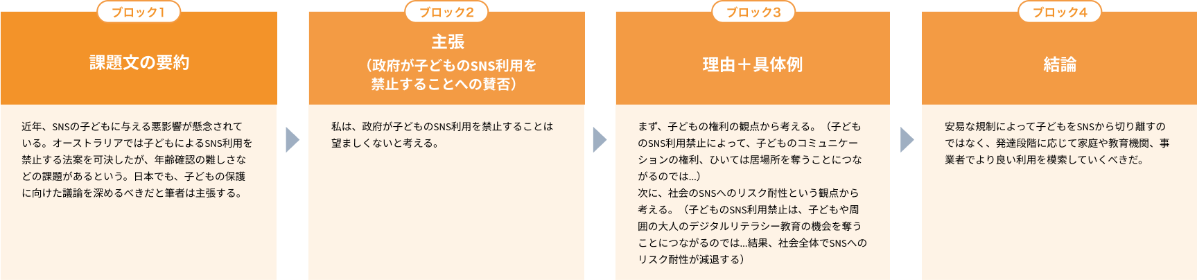 課題文の要約 → 主張(政府が子どものSNS利用を禁止することへの賛否) → 理由+具体例 → 結論