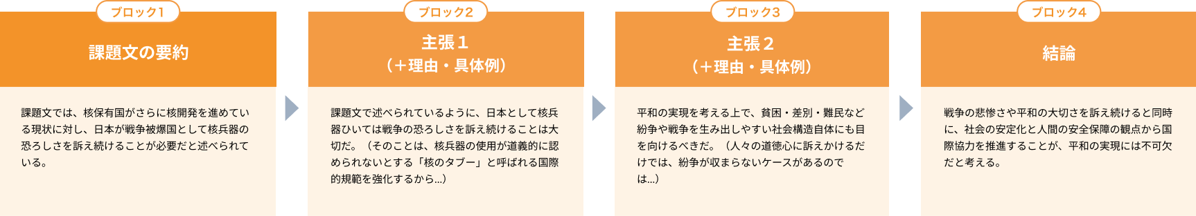 課題文の要約 → 主張1(+理由・具体例) → 主張2(+理由・具体例) → 結論