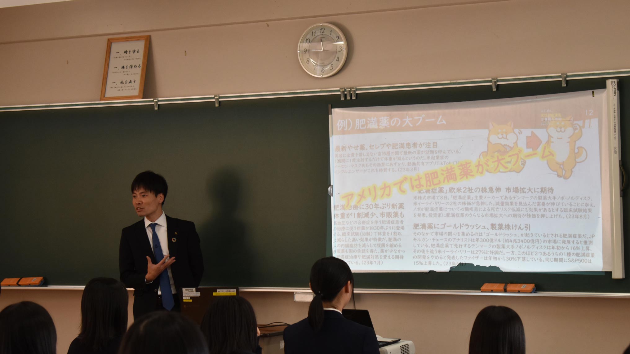 授業では、米国で流行している肥満症治療薬を手がける米製薬大手イーライリリーの株価上昇の話題から始まりました。「飲むとやせる薬」の大流行によって製薬業界だけでなく、アパレルや航空など幅広い業界が恩恵を受けると期待されています。その理由を生徒たちに問うと「痩せて美容に気を遣うようになる」「輸送に飛行機を使うから」といった的確な意見が飛び交いました。森本氏から「肥満という複数の病気の原因が解消されることで、寿命が延びる期待から介護業界の株価も上昇すると予想されている」と別の視点からの解説があると、教室内からは驚きの声も。森本氏は「定性的な情報は様々な解釈ができる。真偽がつきにくいので『疑う力』が大切だ」と強調しました。