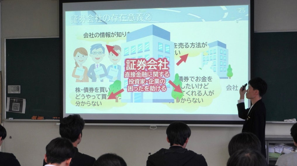 「経済を身近に感じてほしい」という想いから構成された50分の講義。国内有数の証券会社にて金融・経済の第一線で働くプロの話を、35人の生徒らは真剣に聞き入っていました。