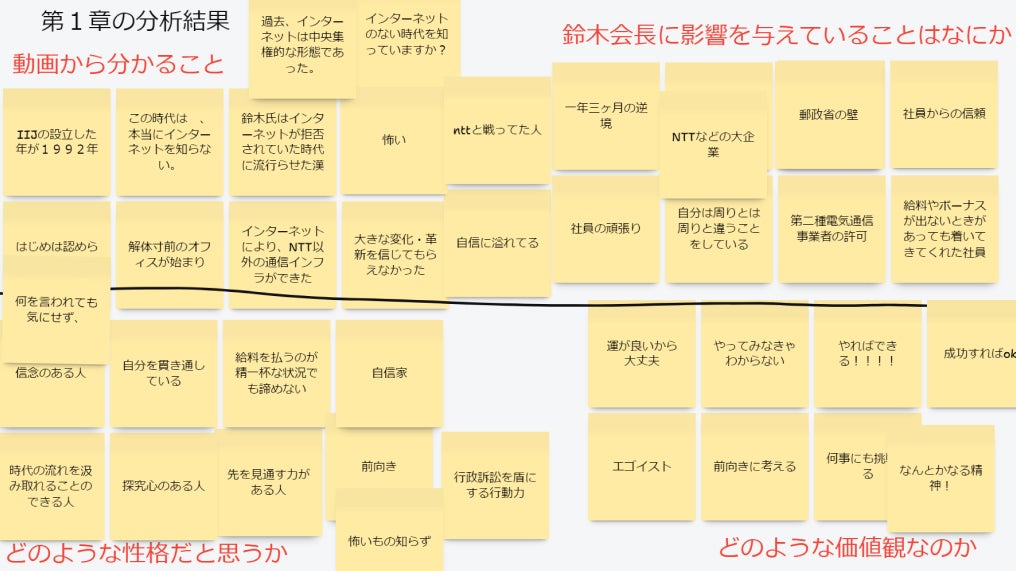 インタビューのための質問づくりでは、グループワークも実施しました。「ジグソー法」と呼ばれる手法で、課題やテーマごとに役割を分担して互いの意見を交わしていきます。ピースを埋めてジグソーパズルを完成させるように全体像を浮かびあがらせます。IIJやインターネットの歩みを調べたうえで、鈴木氏の価値観や人生観といったペルソナ(人格)を分析していきます。