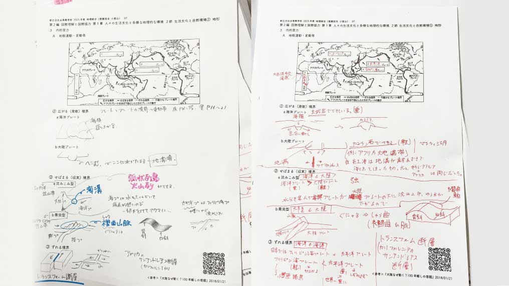 「例えば、世界最高峰の山は?と聞いたら、みんなエベレスト(チョモランマ)と答えられるし、最も低いところは?と聞くとチャレンジャー海淵と答えられる生徒もいるんです。では、その基準がどこにあるのか考えてみましょう。海面からの標高では確かにエベレストが最高峰ですが、世界の海面の基準は場所によって異なります。地球中心部からの距離、と考えると、答えはエベレストではなくなるんです」このように「基準」を揺さぶる問いかけを通じ、生徒は一つの視点にとらわれない思考を学んでいく。
