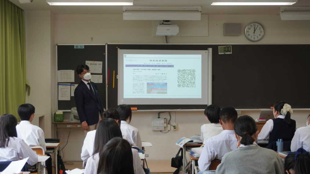生徒自ら考えて学習成果を残すことを大切にする授業だからこそ、パワーポイントの情報は最小限。その中で掲出されたのが、日経電子版の関連記事へ飛ぶQRコードだ。これは、1コマ45分という進学校の中では授業時間が短い日比谷高等学校ならではの工夫である。