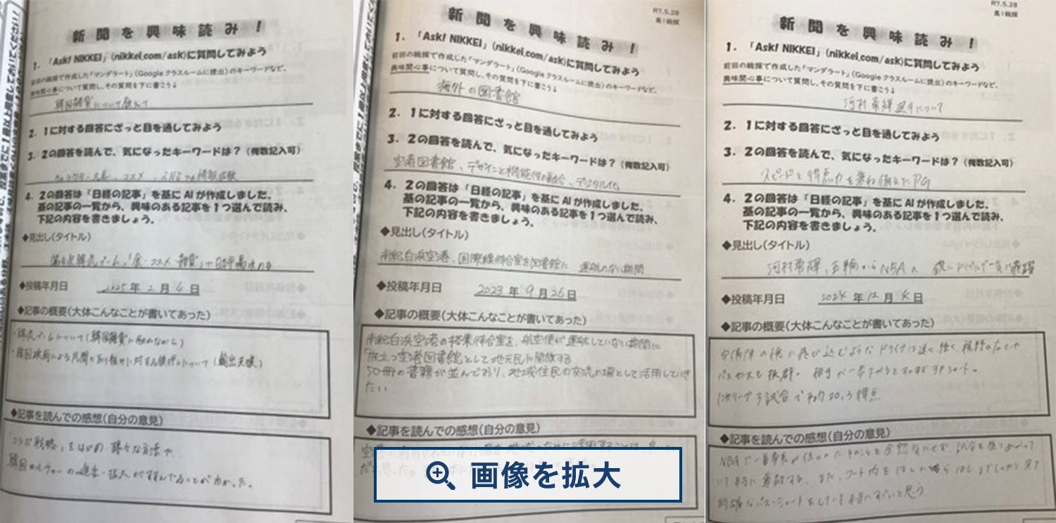 「2学期から始まる本格的な探究活動に向けて、1学期では自分が何に興味をもっているのかを探る活動からスタートします。その活動の一つが『新聞を興味読み!』です。生徒は日経電子版「Ask! Nikkei」で気になるキーワードを元に質問を打ち込み、日経電子版の記事を基に作成された質問に対する回答を読みます。そして、その回答に使われた記事から興味のあるものを読み、少しずつ自身の興味・関心を洗い出していきます」
