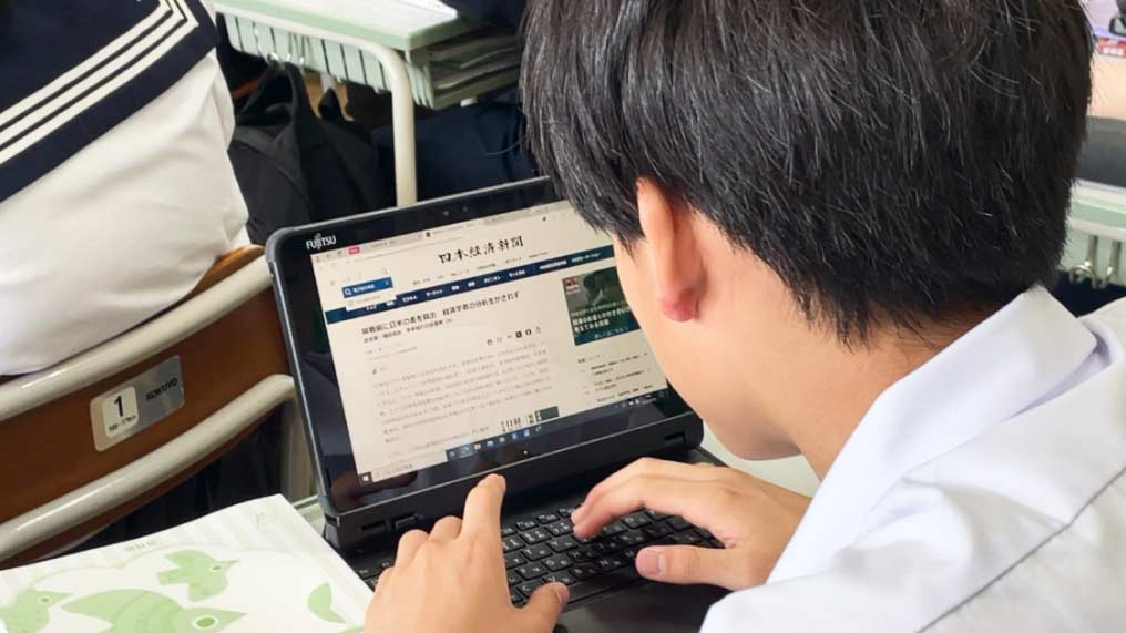 授業中には、先生が発言した言葉を即座に日経電子版で調べて学習する生徒の姿も多く見られた。調べ学習の発展形として、生徒の知的好奇心をはぐくむ主体的な学びに日経電子版が活用されている。