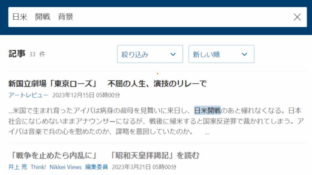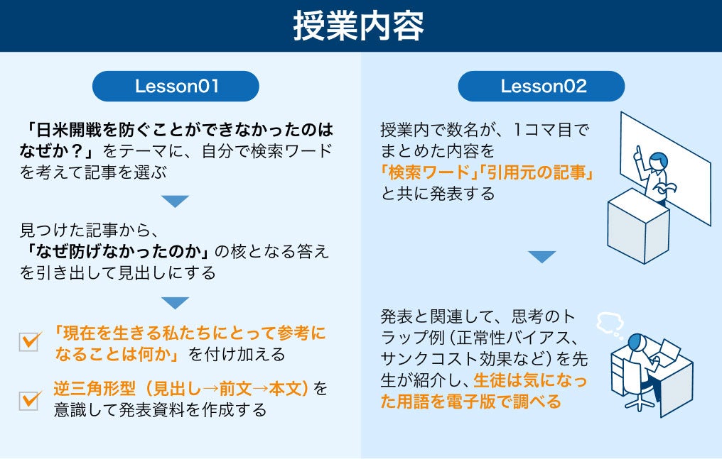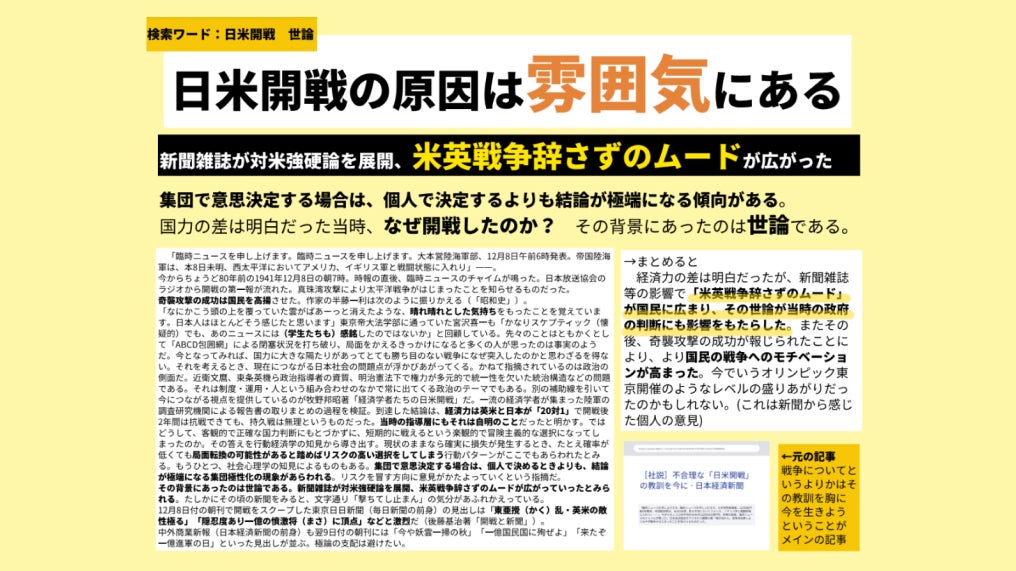 授業では、日本史としての日米開戦について、「なぜ太平洋戦争を防ぐことができなかったのか」という問いを、生徒一人一人が考える機会を設けた。生徒は、それぞれに付与された日経電子版のアカウントを利用し、記事を検索・参照した上で、自身で調べて整理した内容を一枚のスライドにまとめる