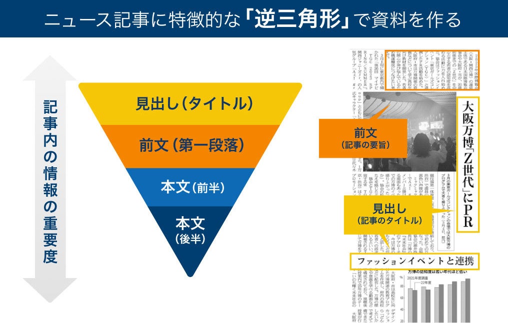 新聞記事で典型的な文章の組み立て方である「逆三角形型」で作られた発表資料は、多くの生徒を預かる先生にとっても要点が掴みやすいメリットがある。