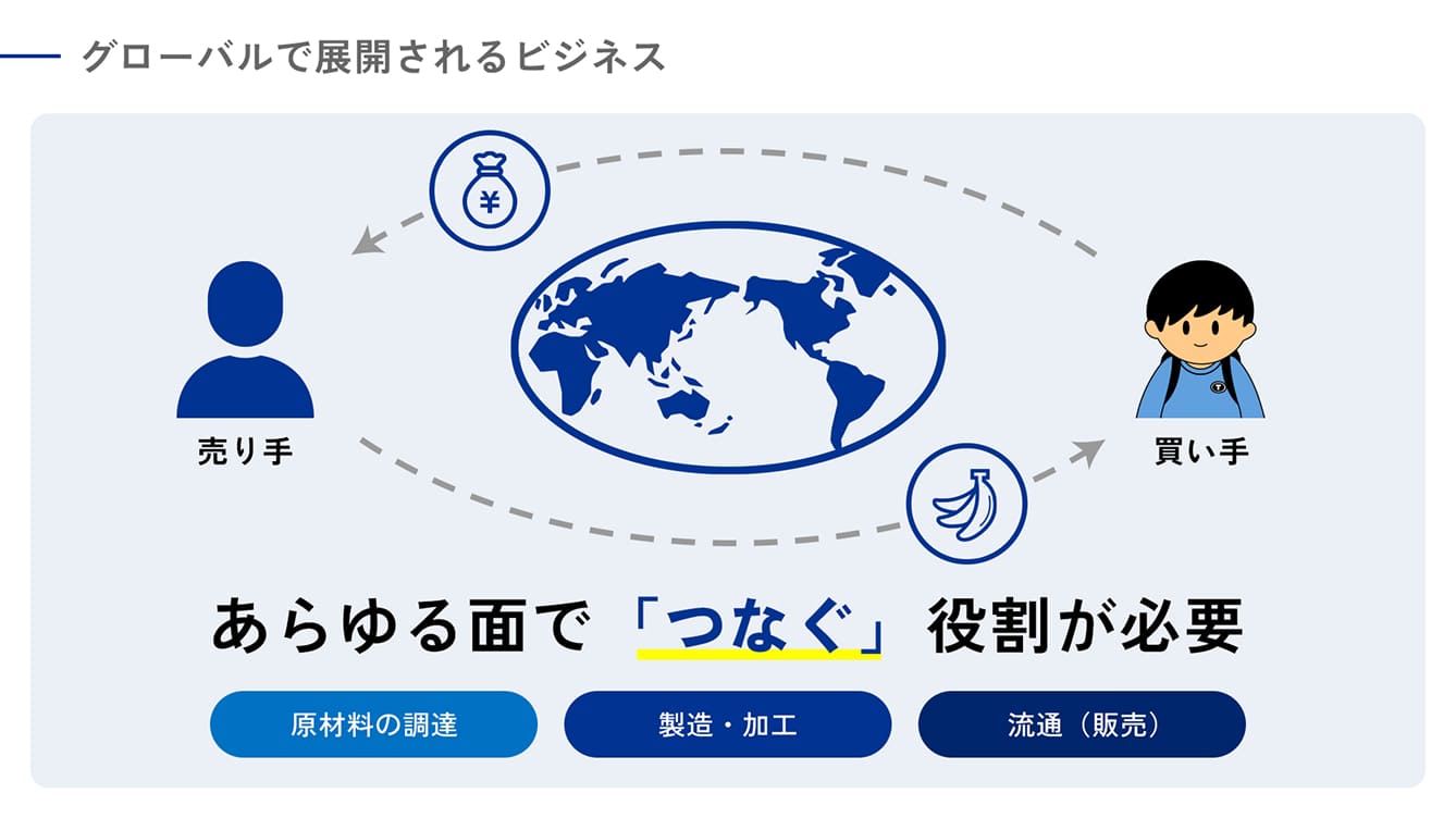 私たちの暮らす社会では文化や習慣を超え、グローバル規模のネットワークで、さまざまなビジネスが国内外で展開されています。それができるのは「売り手」と「買い手」をつなぐ存在がいるからです。