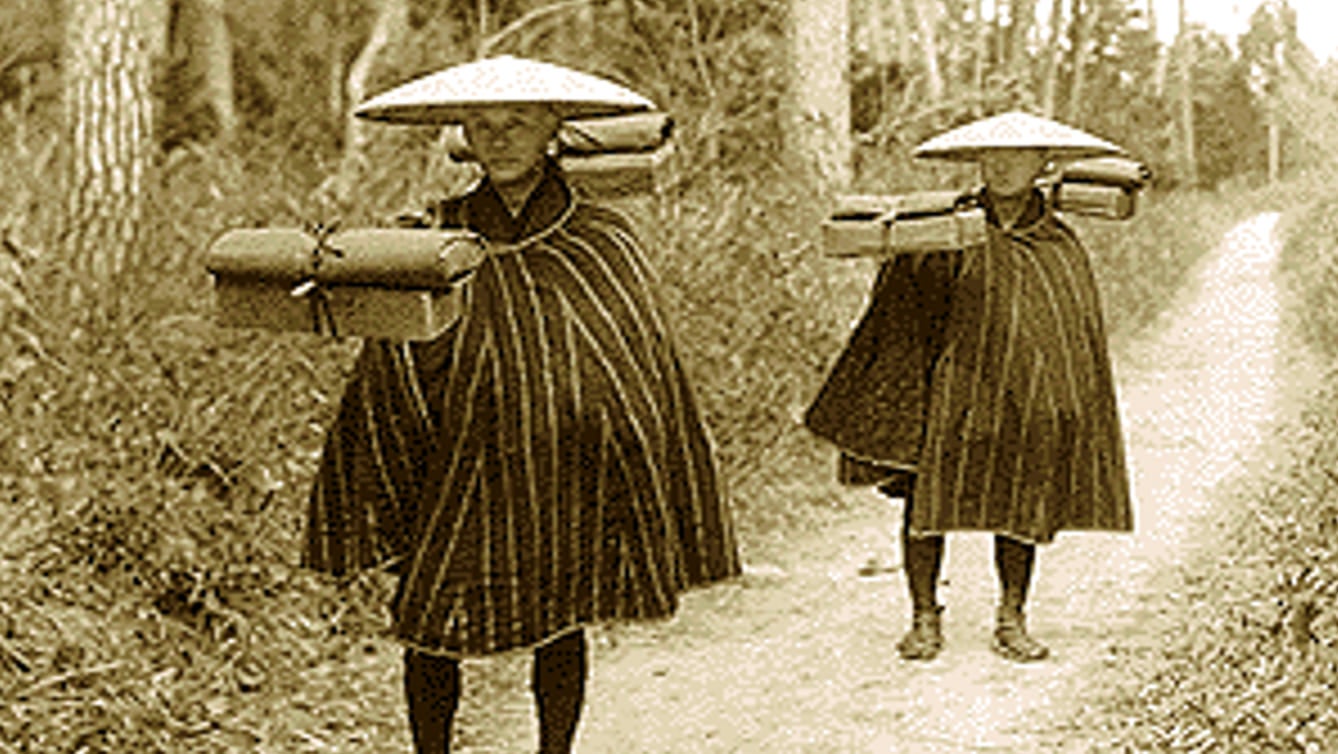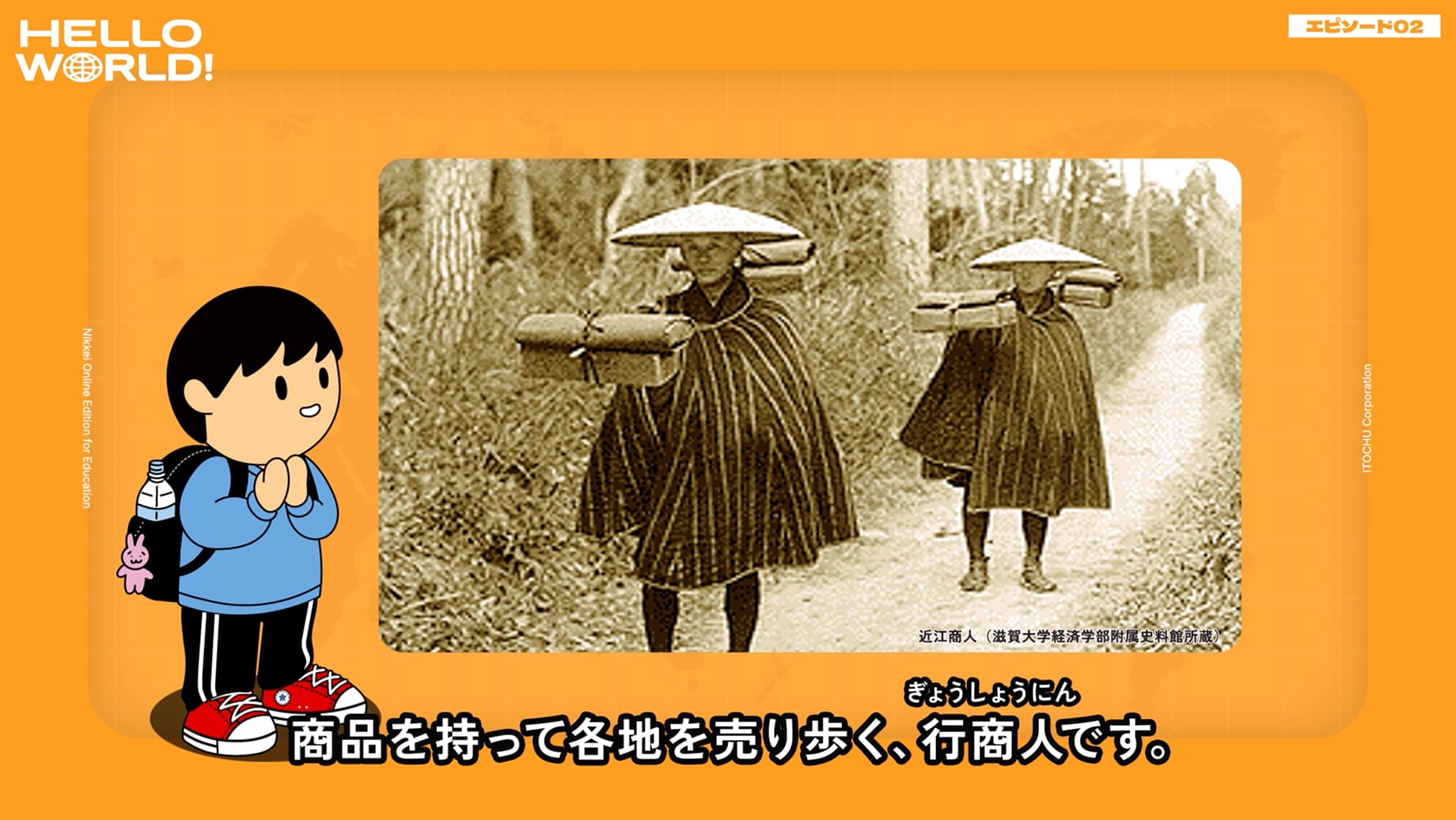 ここは江戸時代後期の琵琶湖畔。天秤棒を肩にかついで、その土地の名産品を各地に行商している人たちがいますね。この「近江商人」が伊藤忠商事のルーツです。
