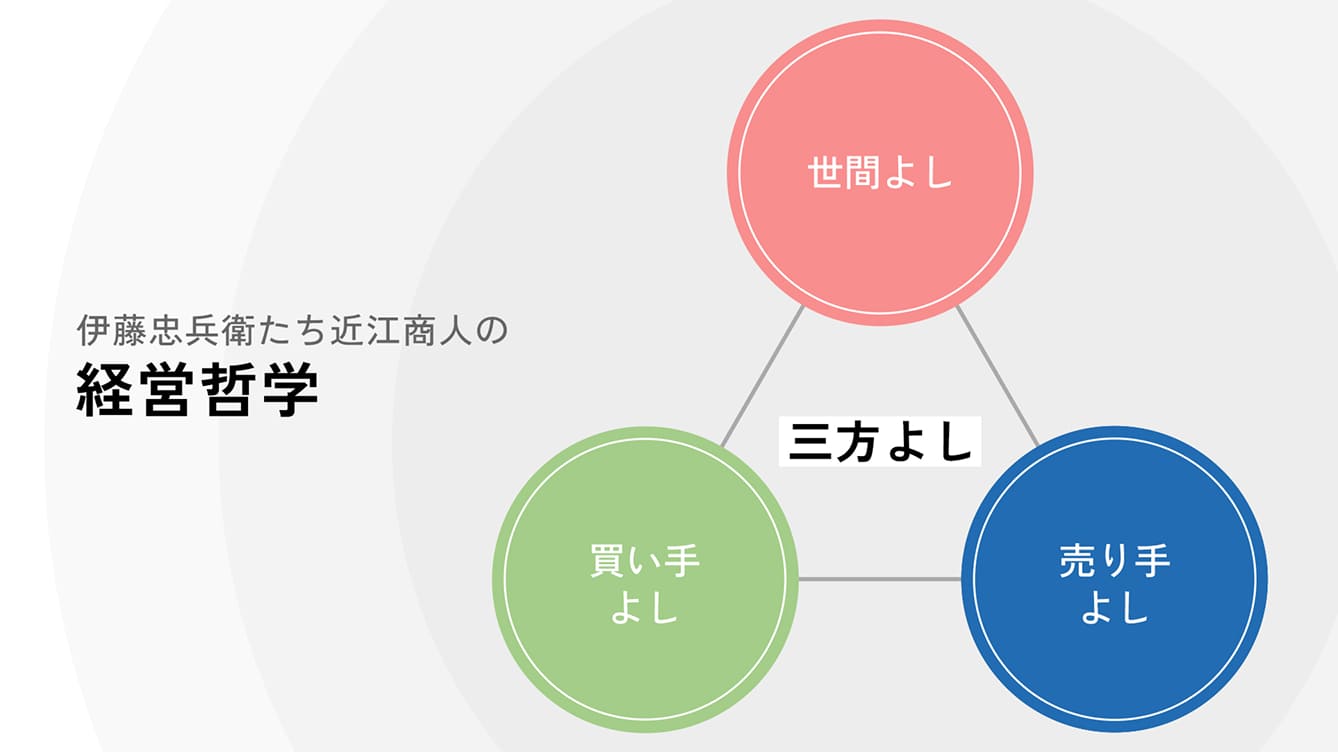 そんな伊藤忠兵衛たち近江商人の経営哲学を表す言葉が「三方よし」です。