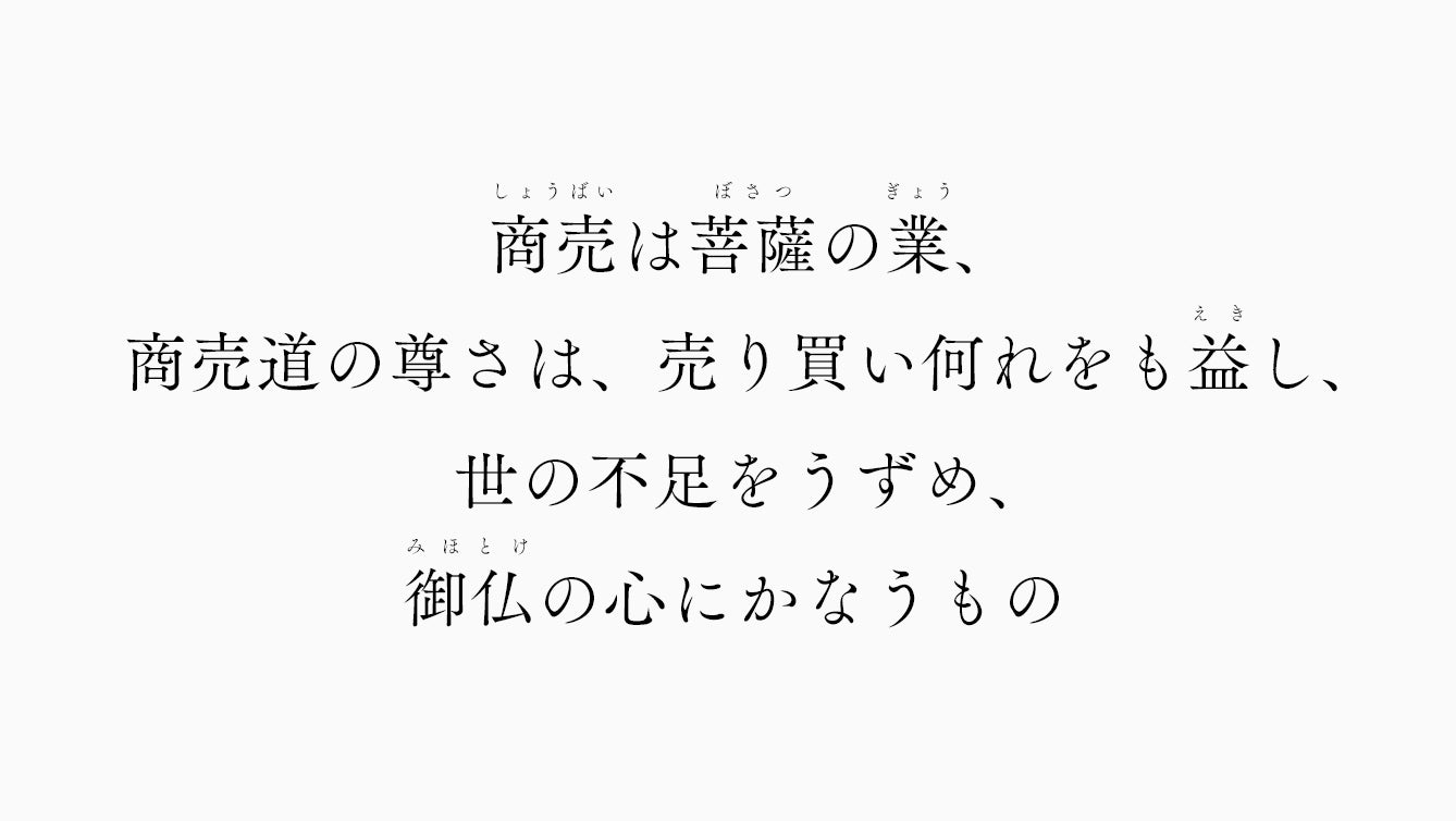 「三方よし(売り手よし、買い手よし、世間よし)」という表現は、近江商人の経営哲学を表す標語として後世に作られたものです。そしてそのルーツは、伊藤忠兵衛が先輩の近江商人たちへの尊敬の念を込めて唱えた「商売は菩薩の業」という言葉であると言われています。