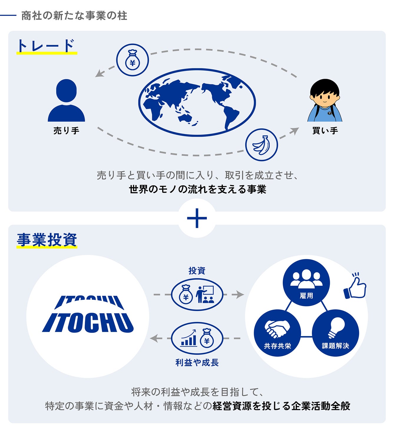 そこで、従来の売り手と買い手の間に入り、取引を成立させ、世界のモノの流れを支えるトレードビジネスに加えて、商社の新たな事業の柱として出てきたのが、