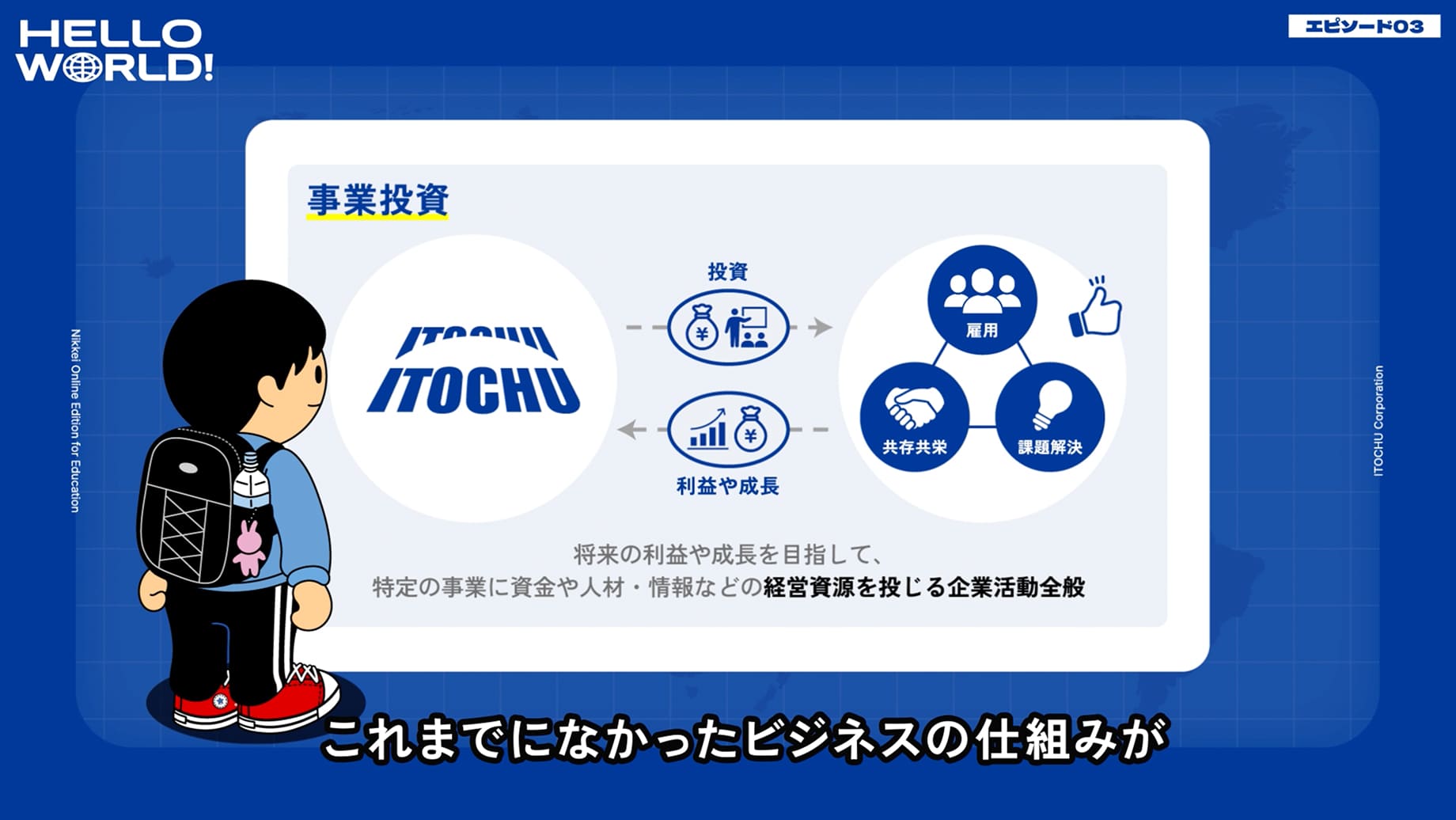 事業投資とは、将来の利益や成長を目指して、特定の事業に資金や人材・情報などの経営資源を投じる企業活動全般を言います。投資というと「お金を出す」だけのイメージがあるかもしれませんが、そうではなく、事業そのものの価値を高め、事業の成長にも伊藤忠商事が参画するのが特徴です。