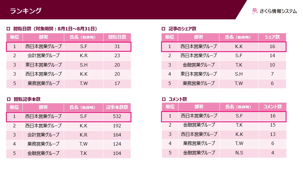 ランキングでは、どのデバイスで記事を閲覧しているか、どのように日々記事を選定しているか、好事例の投稿の抜粋なども含めてフィードバックをしています。誰でも褒められることは嬉しいことだと思うので、小さいことでも取り上げています。