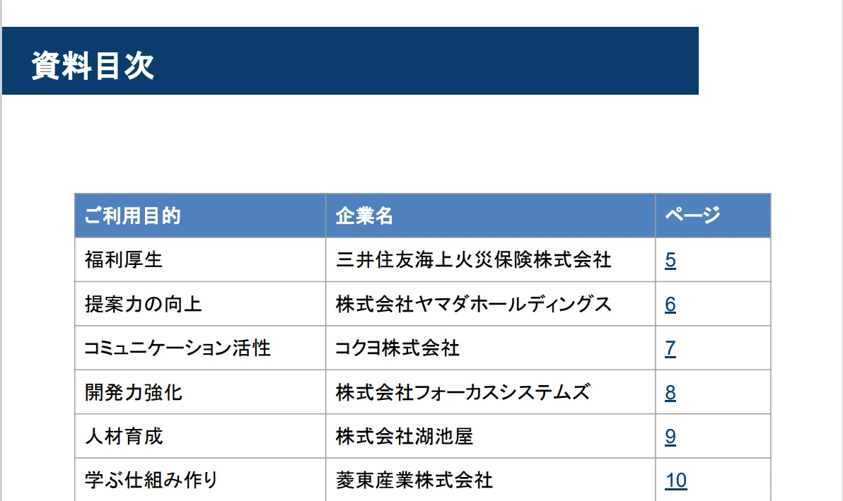 人材育成、営業力強化、福利厚生など、導入目的はさまざま。 各社の課題や導入目的、導入後の効果をご覧いただき、自社での活用イメージをつかんでいただけます。