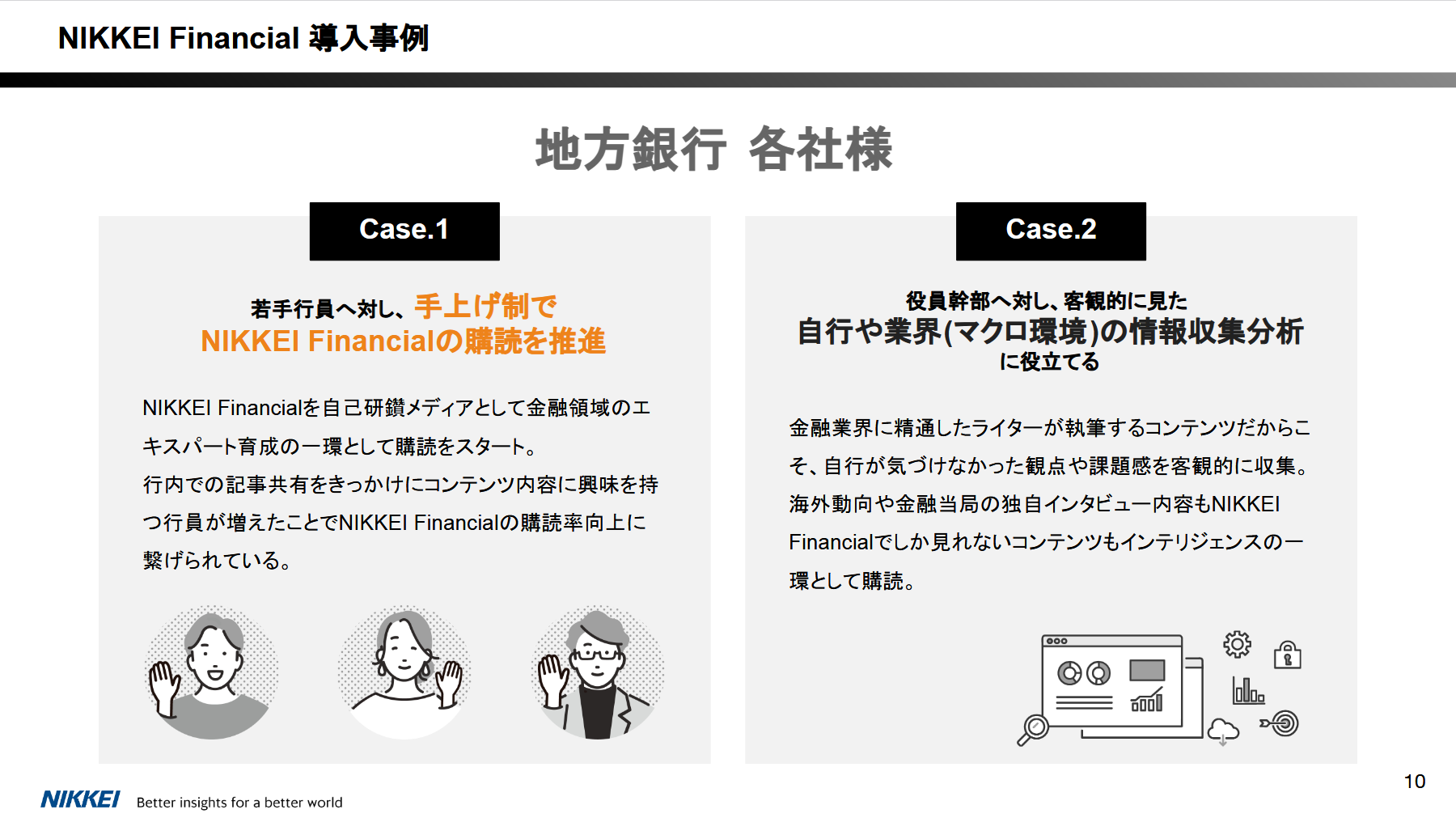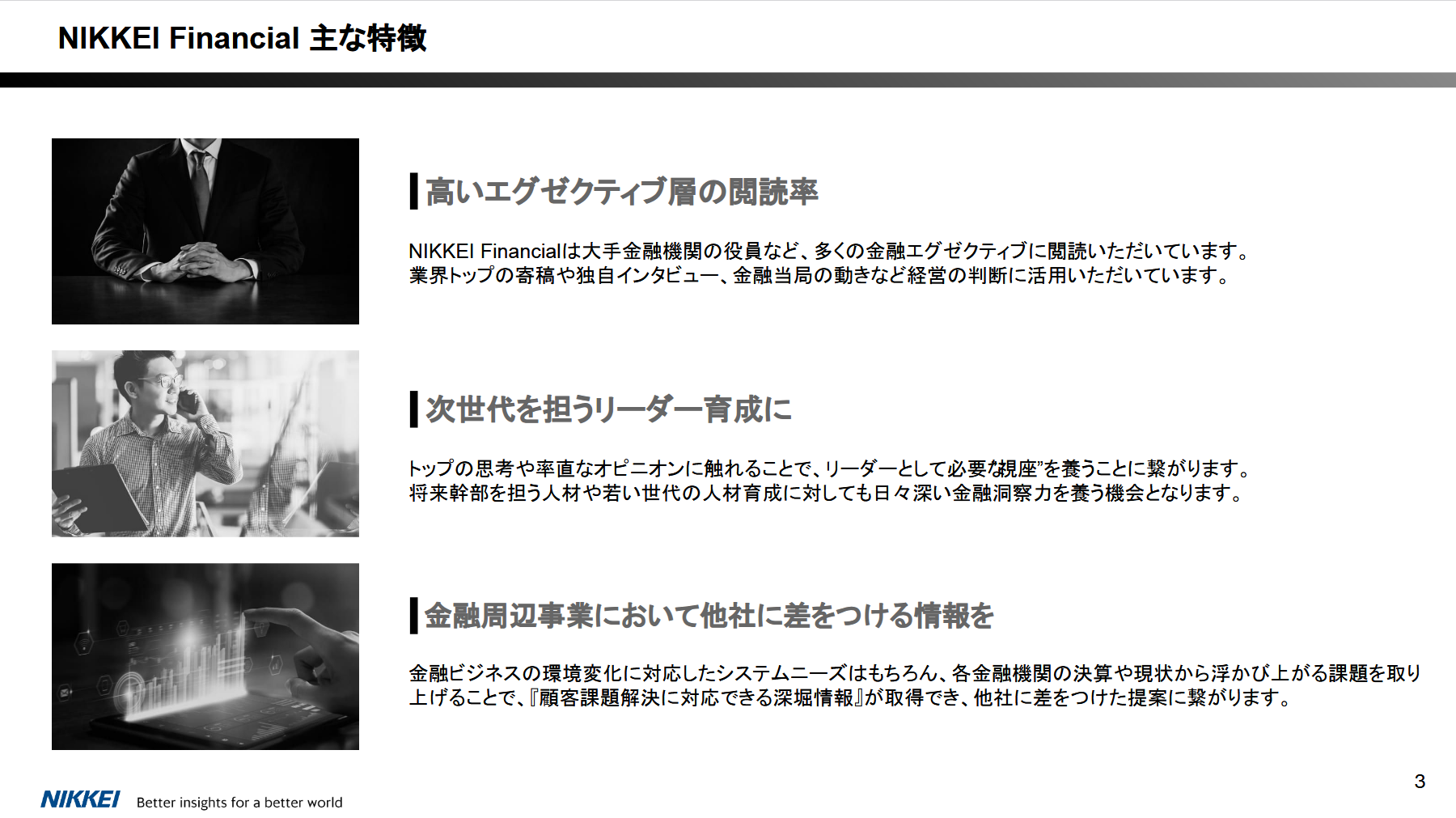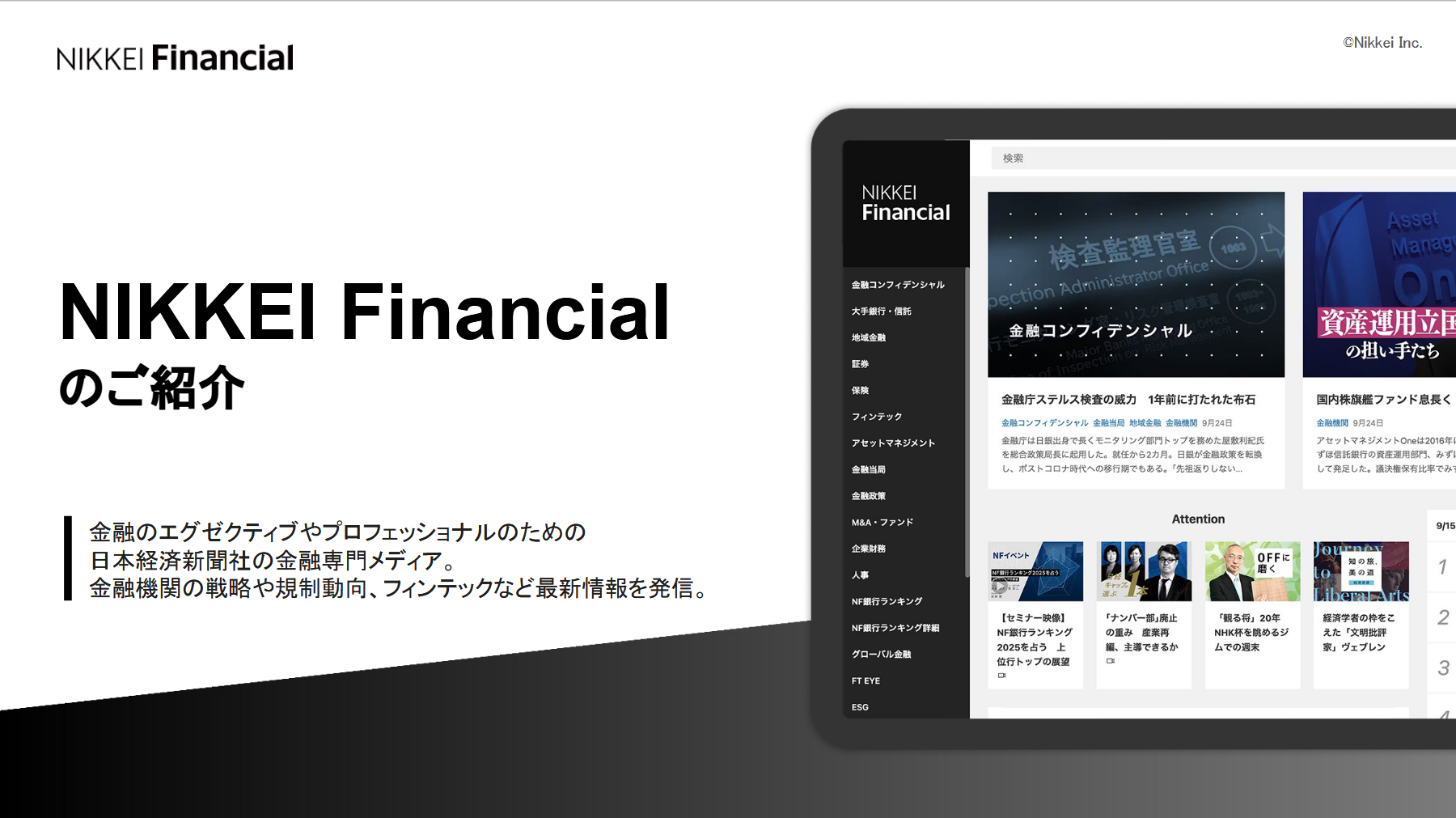 本資料は、金融のエグゼクティブやプロフェッショナルのための金融専門メディア、NIKKEI Financialの法人様向けご紹介資料です。国内外の金融動向に加え、金融当局の政策や規制まで網羅。表層的なニュースではなく、意思決定に直結する“深いインサイト”を得られます。