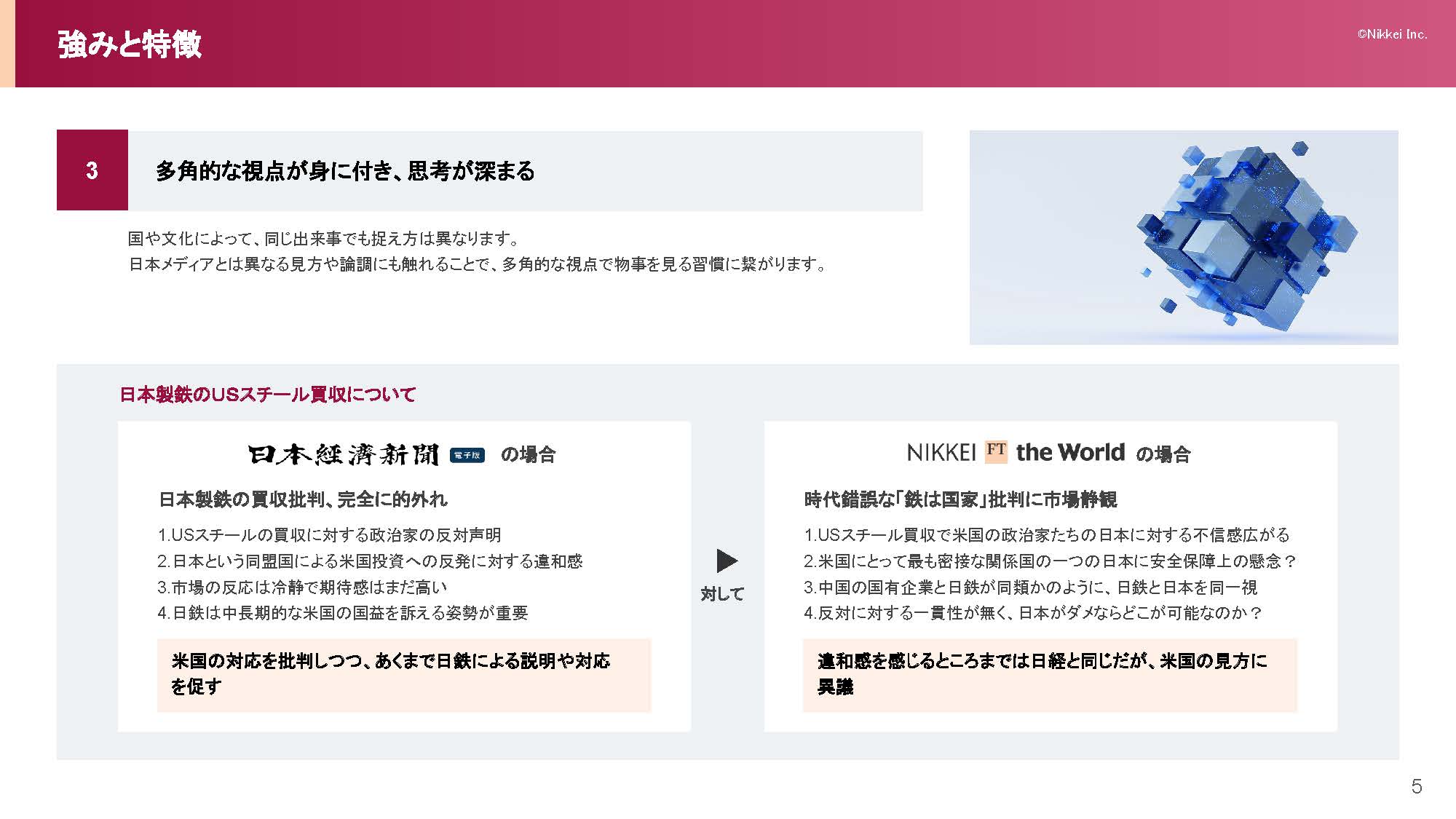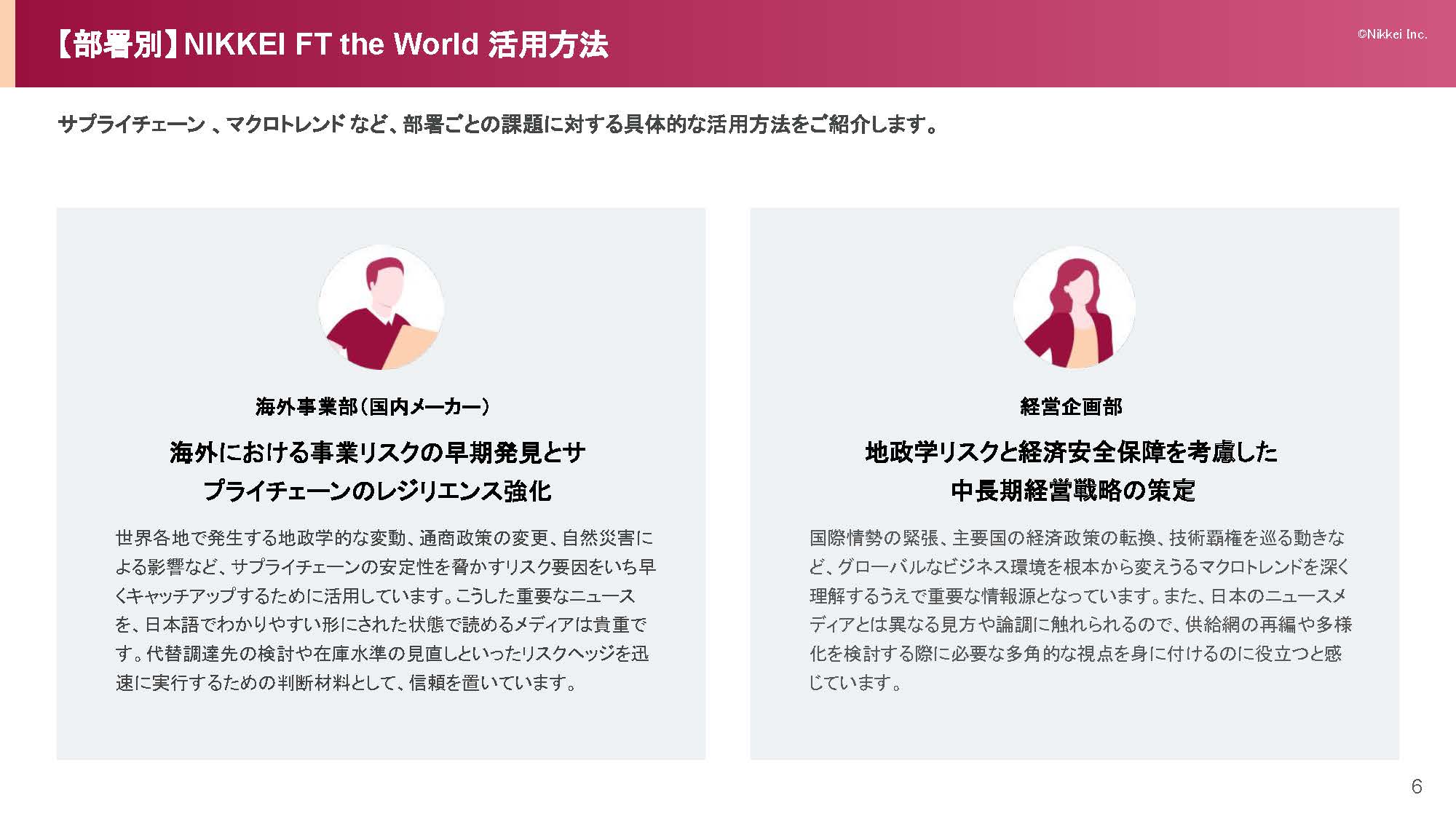 本資料は、グローバルな視点での情報収集課題を解決する専門メディア「NIKKEI FT the World」の法人様向けご紹介資料です。海外情報は分散し、言語の壁もある中で、FTの厳選記事を日本語で提供し、グローバル時代の意思決定を支援します。