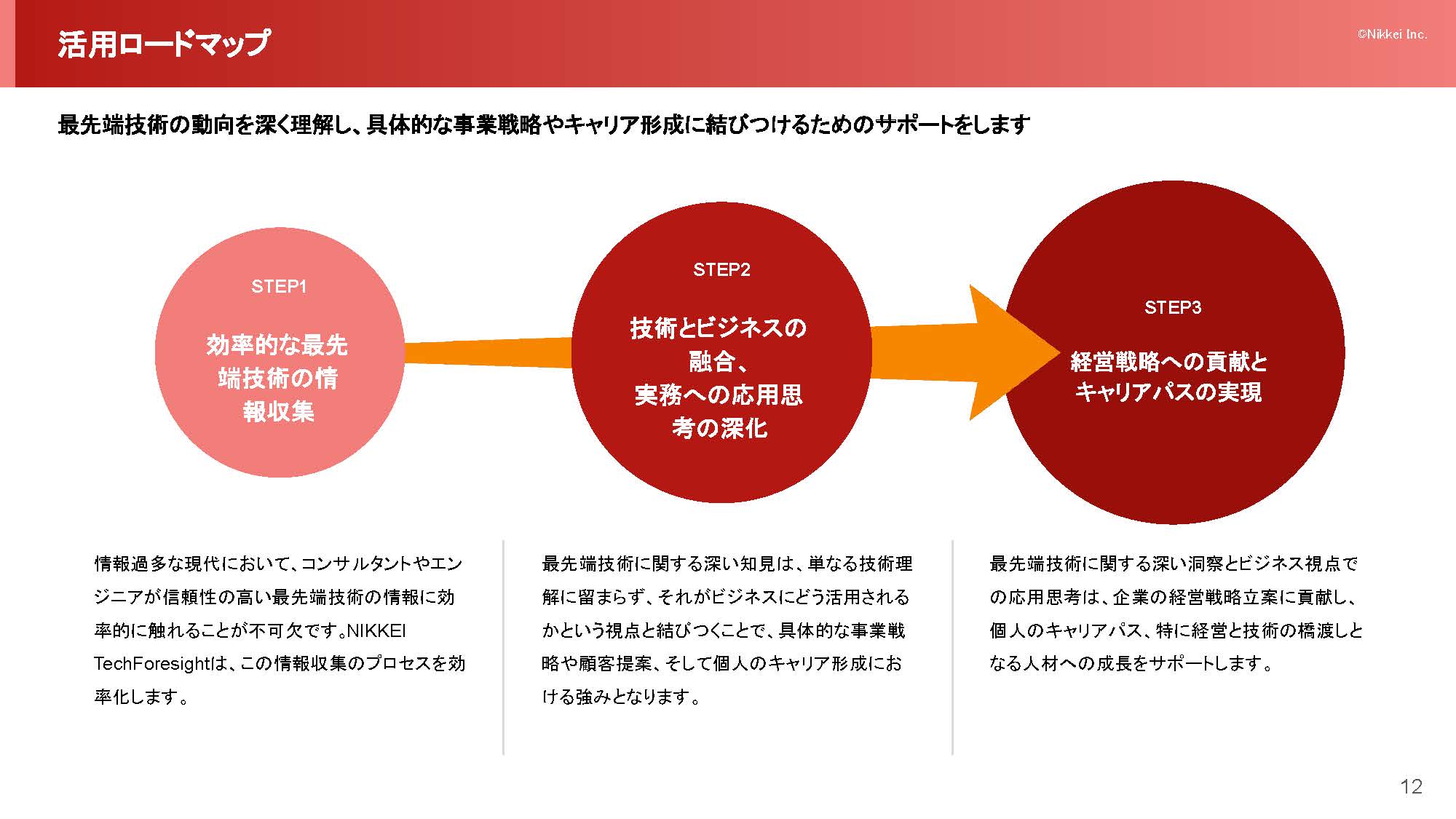 本資料は、半導体やAI、量子コンピューター、次世代電池など、ディープテック領域における情報収集の課題を解決する専門メディア「NIKKEI Tech Foresight」の法人様向けご紹介資料です。分散・複雑化する先端技術情報を整理し、戦略策定と意思決定を支援します。
