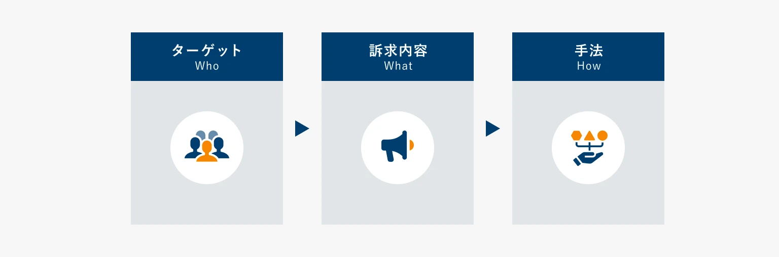 マーケティングでは施策を考える際、「ターゲット(Who)⇨訴求内容(What)⇨手法(How)」の順に考えることが定石とされています。