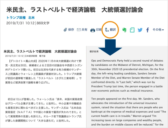 ワンクリックで翻訳記事を日英・日中併記で表示します。翻訳された英文・中文は編集や保存、印刷が可能です。