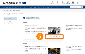 ⑤ シェアされた記事に対して「いいね」やコメントを付けることができます