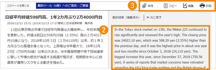 - ② 英文に翻訳された記事が画面右側に表示されます