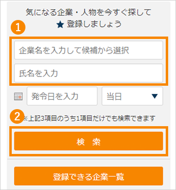 - ① 画面右にある検索画面から、登録したい企業名または個人名を入力