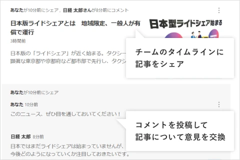記事をグループ専用のタイムラインに投稿でき、コメントをつけることができます。記事を起点にしたコミュニケーションでチームのアイデア創出をサポートします。