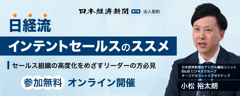本セミナーでは、インテントセールスの基本的な考え方から、日本経済新聞社が実践している具体的な取り組みや成果までを分かりやすく解説いたします。新規商談化率の向上やアウトバウンドセールスの強化、顧客体験を損なわない営業活動の実現など、セールス組織の高度化を目指しているリーダーの皆様はぜひご活用ください。