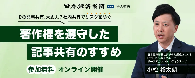本ウェビナーでは、デジタル時代に起こりやすい著作権侵害の具体的なシーンを整理した上で、日経電子版Proのギフト機能・グループ機能を活用した、著作権を遵守しながら効率的に記事を共有する方法を分かりやすく解説します。
