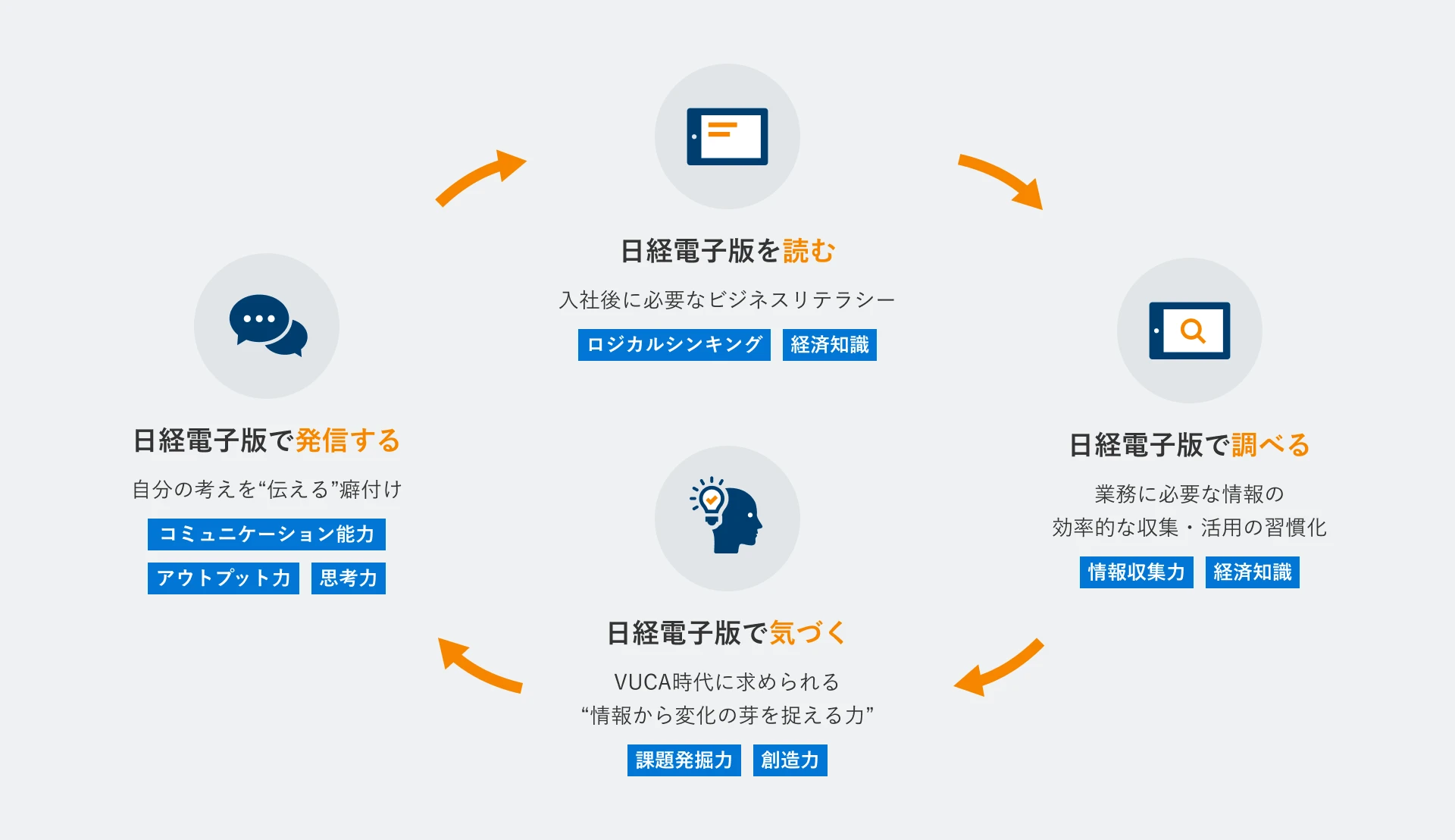 日経電子版を使った研修では、ビジネス基礎力を網羅的に養うことができ、自律的な成長を促します。