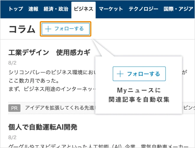 フォロー機能でフォローした企業やキーワードに関連する記事は赤枠で囲まれます。興味のある記事は見逃しません。