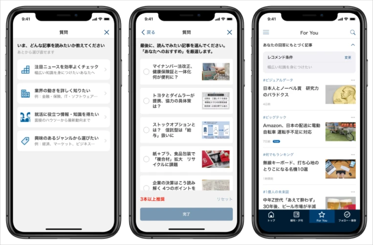 ご自身の年代や所属業界、好みをもとに、仕事や成長に役立つ記事をレコメンドします。レコメンド記事は、日経電子版のアプリ「For You」タブより読むことができます。