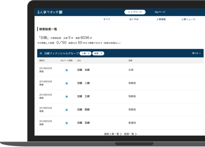 「日経人事ウオッチ」は日本経済新聞社のネットワークをもとにした人事情報サービスです。上場企業を中心に、非上場企業、官公庁、団体など約7,400社の人事情報を収録しています。