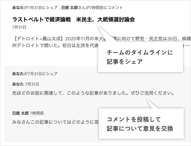 コメントとあわせて、記事をグループ専用のタイムラインに投稿できます。投稿された記事には、コメントをつけることができます。記事を起点にしたコミュニケーションでチームのアイデア創出をサポートします。