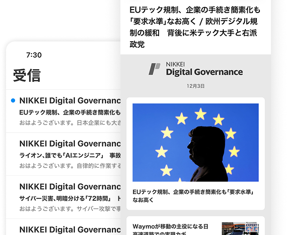 メール受信設定で「登録する」を選んでいただくと、NIKKEI Digital Governance のその日の注目記事や最新コンテンツをメールでお届けします。原則、月曜日〜土曜日の毎朝6時に配信します。